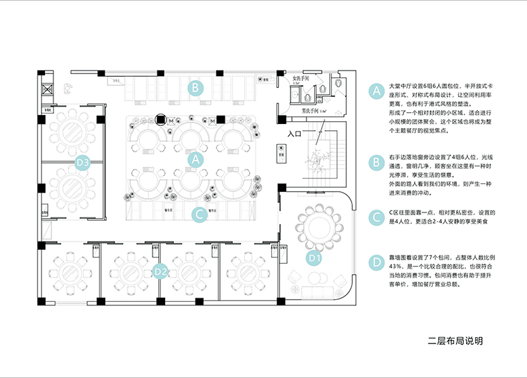 二樓布局以6人桌和包間為主,在內(nèi)地地區(qū)以式熟人關(guān)系為主人際關(guān)系,多包間隔離式就餐環(huán)境,能有效避免不必要人際的羈絆,從而使食客更放松安心就餐。