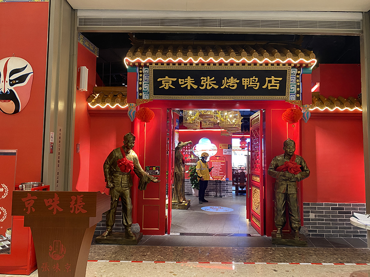 品深設計全案升級的京味張烤鴨店,是北京菜的代表品牌,整個門面采用大面積中國紅,非常鮮明,醒目。消費者可以用一句話就表達出來:整個門面全部是紅色那個餐廳。這就很好被消費者傳播了。色彩色調搭配在門面設計、門頭設計中需要重點考慮,合理搭配。