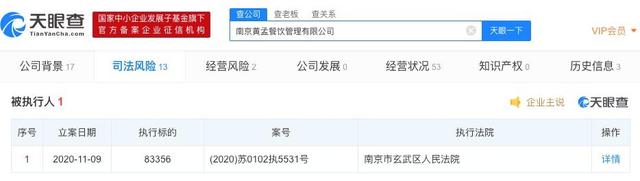 天眼查App顯示,近日,南京黃孟餐飲管理有限公司新增一條被執(zhí)行人信息,執(zhí)行法院為南京市玄武區(qū)人民法院,案號為(2020)蘇0102執(zhí)5531號,執(zhí)行標(biāo)的83356。據(jù)新京報報道,黃磊和孟非共同經(jīng)營的火鍋店“黃粱一孟”所屬公司即為南京黃孟餐飲管理有限公司。目前,該店已經(jīng)閉店。此外,今年9月,南京黃孟餐飲管理有限公司發(fā)生工商變更,黃磊退出投資人。