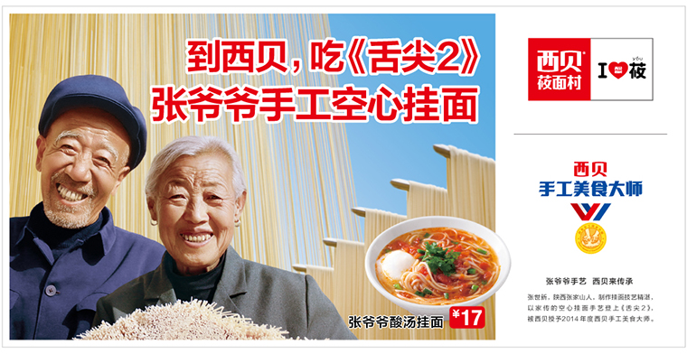 西貝莜面村與“舌尖上的中國(guó)”里張爺爺空心掛面的創(chuàng)始人合作,對(duì)外宣傳“吃張爺爺空心掛面,感受舌尖上的味道”。