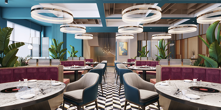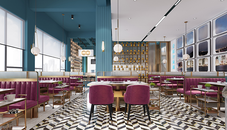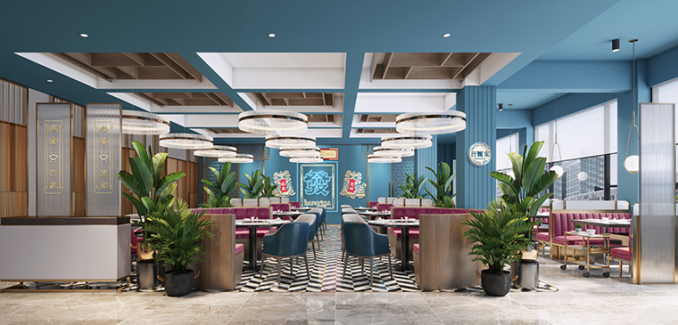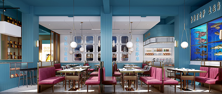根據(jù)行家港式火鍋的品牌定位,我們餐廳的整體氛圍應(yīng)該輕奢且品質(zhì)感很強;熱鬧卻不喧囂,精致有特色但容易讓人親近!整個餐廳的色彩以暖色調(diào)的不銹鋼金色為主,凸顯火鍋的用餐熱鬧,同時也讓顧客更容易親近,柜體運藍色表達出鮮明的港式風(fēng)格,同時也點明我們海鮮火鍋的特色。