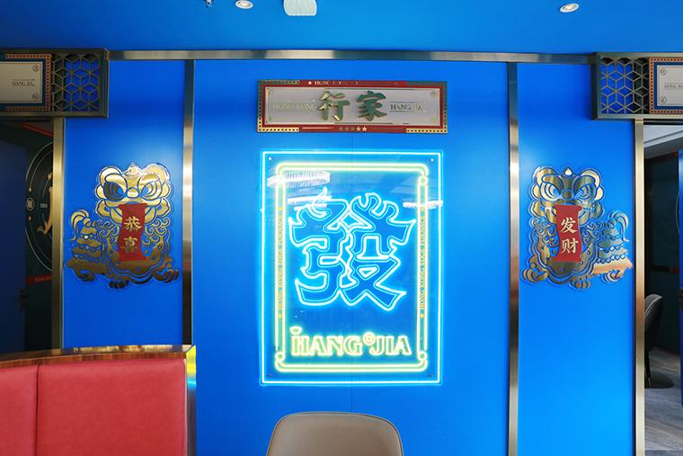 餐廳的主入口處,人流最密集之地,也是品牌首選的亮相之處。展現(xiàn)品牌主形象LOGO,以香港常見的霓虹燈材質(zhì),四周放射性線條,極具識別度,既有鮮明的港式風(fēng)格,又能吸引消費者打卡拍照分享;上樓梯處再用不銹鋼金屬字強調(diào)品牌名字“我就是行家”;1樓大廳一整面墻的香港城市景色照片,讓消費者有一種身臨其境的感受;二樓大廳正面形象墻以行家牌匾+立體浮雕醒獅,最經(jīng)典的港式匾額傳達花膠雞悠久厚重的歷史,兩側(cè)喜慶的南派醒獅,吉祥又可愛,與品牌LOGO彼此呼應(yīng)。