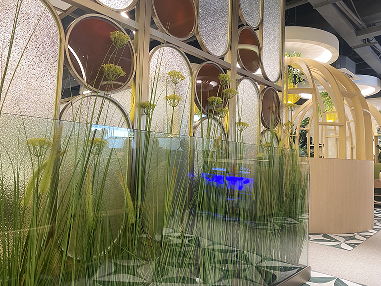 我們想到了磨砂玻璃這一材質,在餐廳立面的隔斷、包間的墻體,我們使用了磨砂玻璃及玻璃方磚,這種材料在燈光照耀下,有一種晶瑩剔透的感覺,用裝飾材料特性表現菜品清湯這一核心特征,打造出時尚清新,通透舒適的空間感受。