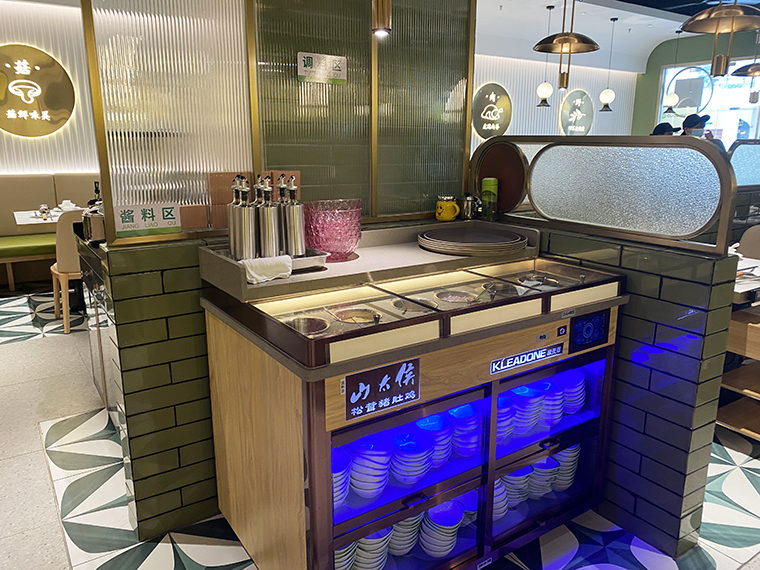 為了營造自然,清新,通透的空間感受,體現咕咕豬肚雞清湯養生特點,品深餐飲裝飾設計團隊使用了淺木色半包鳥籠造型,隔斷中遍種仿真綠植,墻面以淺白色手工磚突出了發光不銹鋼廣告畫面的內容,簡約又具有鮮明的廣告效果,很好地將咕咕豬肚雞的品牌文化、品牌形象及品牌內容在空間中展現出來了。