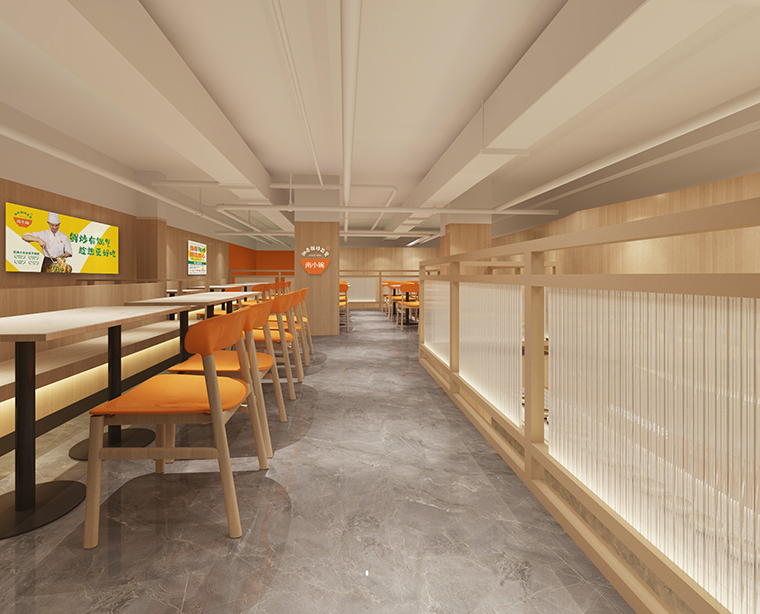 2、門(mén)口大面積落地玻璃、墻面使用板材,白色大理石臺(tái)面、灰色地面、木色桌面,橙色亞克力板。整個(gè)空間追求明亮、整潔、舒適的視覺(jué)感受。尤其是門(mén)口的落地玻璃,窗明幾凈,讓路過(guò)的消費(fèi)者都能看見(jiàn)店內(nèi)熱火朝天的狀態(tài),鍋氣繚繞的煙火氣,產(chǎn)生強(qiáng)烈的進(jìn)店沖動(dòng)。