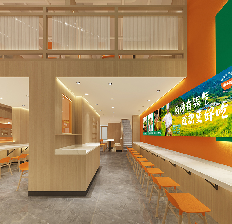 3、內(nèi)部使用大面積的橙色體現(xiàn)鮮炒有鍋氣的特點(diǎn),橙色既使人產(chǎn)生一種陽(yáng)光熱情的心里感受,又是現(xiàn)炒時(shí)火焰的顏色,體現(xiàn)了現(xiàn)炒的特性,識(shí)別度非常高。整面墻的木色板材,木色有自己獨(dú)特的質(zhì)感、在空間中又更有親和力,在狹窄的簡(jiǎn)餐空間中也會(huì)讓人感受到輕松,給人一種可釋?xiě)训挠鋹偅屓穗S時(shí)隨地都能感受到大自然的生機(jī)。