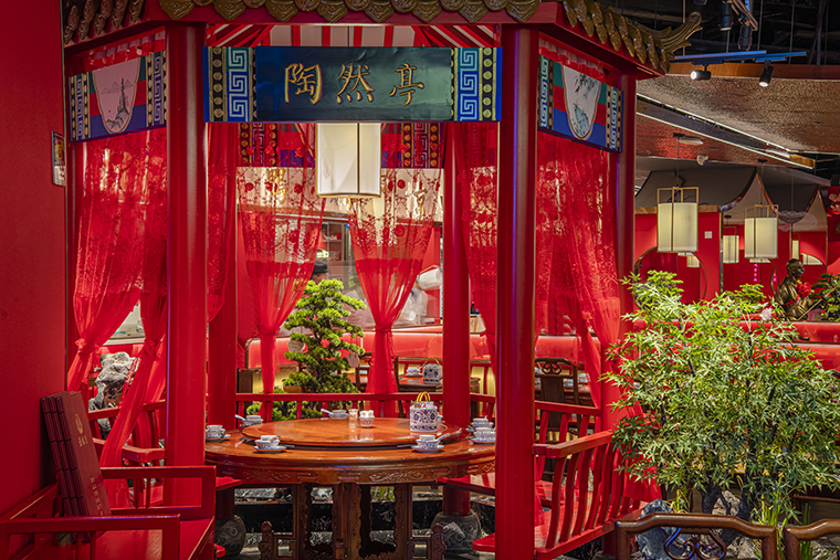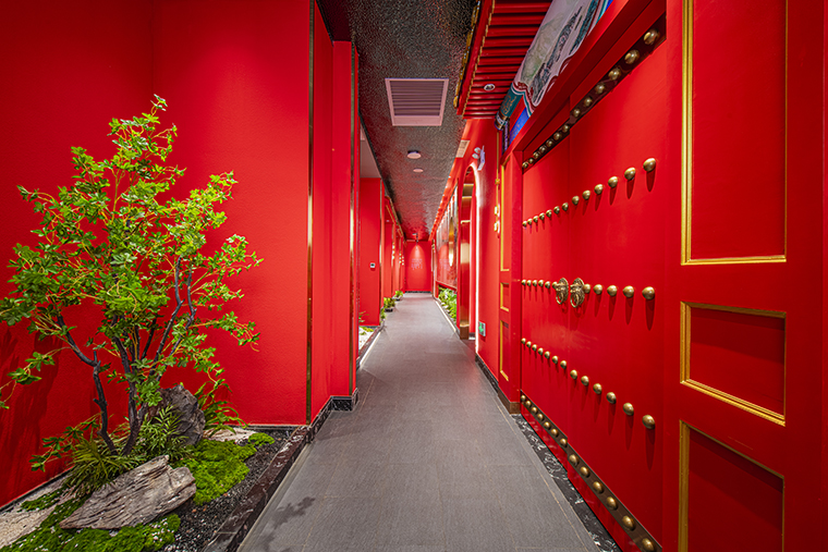 1、本項目為京味張東莞大朗碧桂園里悅里店,總面積約829平方米。用中國紅強化品牌內(nèi)含的北京皇城文化,令人印象鮮明;