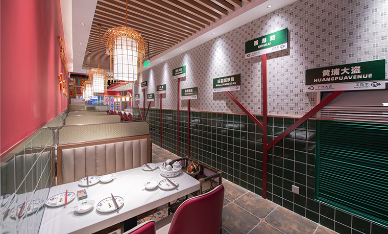 將廣州西關熱鬧的街市、老廣州人提籠遛鳥的生活方式、令人向往的西關大屋,有濃烈廣州氣息的廣式花窗,廣式青磚引入空間設計中。青磚石墻、廣式花窗、店招門牌、路牌指引、飲茶的風俗習慣等元素地道純正植入到整個門店氛圍中,一下子驚艷了上海灘。