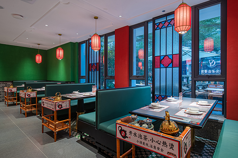 1、用品牌強關聯的具體一個元素串聯整個裝飾,形成品牌專屬識別記憶。空間中我們使用了滿洲窗,用滿洲花窗串聯整個門店,與品牌傳達的西關老號,五代傳承高度貼合,拍照打卡效果很好,老茶樓的氛圍感迅速出來了。